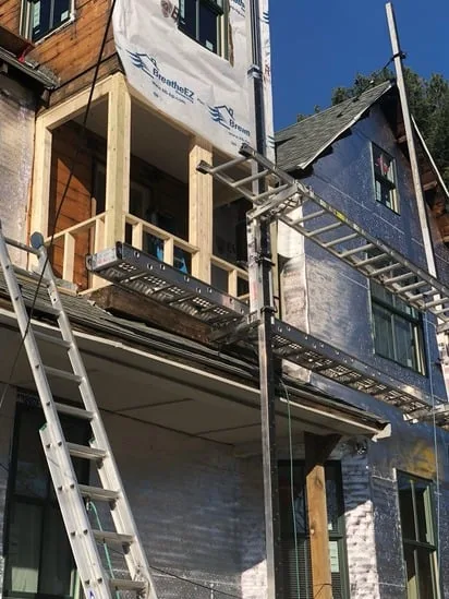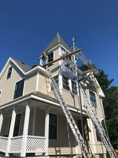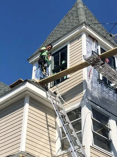 This project involved the complete exterior transformation of a Victorian-style residence using high-durability Everlast composite siding. Furthermore, the installation required specialized pump-jack scaffolding to reach the intricate peaks and gables of the third-story turret. Consequently, the team focused on precision around the window casings and architectural trim to ensure a weather-tight seal while maintaining the home’s classic aesthetic. In addition to the siding, the project integrated updated house wrap and flashing to enhance the building’s thermal performance and long-term moisture protection.